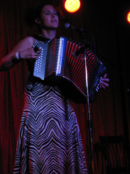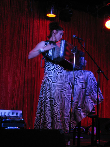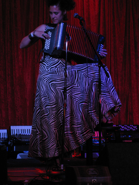 Duckmandu played punk classics from groups like the Dead Kennedys with all the intensity that a punk accordionist can muster and the skill of a virtuosic master. His famous Donald Duck hat was donned and at one point lit aflame. Amy Denio brought a Middle Eastern flavor to the festivities and used her voice to create sounds both associated with vocals and those that seemed to be from another instrument. Count Smokula schmalzted and waltzed his way around music and comedy in his inimitable style. Mark Growden wooed the audience with the deep tones of his voice and accordion. Jason Webley got the crowd to their feet, twirling with fingers in air, and singing along. He even gave up the stage for an engagement proposal (in Russian...she said "Da") to a couple who met at a Jason Webley concert. The night ended with 6 accordionists on stage playing "We Are The World". We definitely were the world of Monsters of Accordion!