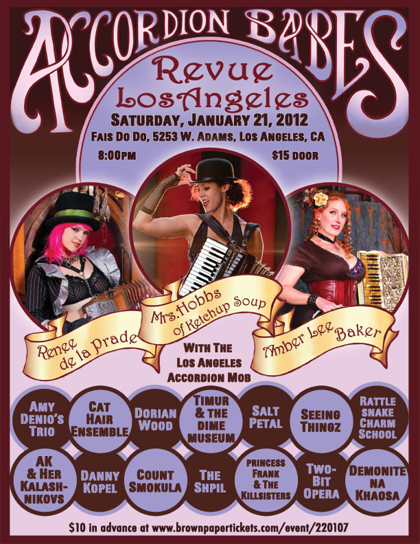 THE ACCORDION BABES REVUE is a night of diverse musical revelry celebrating the accordion, featuring Accordion Babe Pinup Calendar girls Mrs. Hobbs of Ketchup Soup, Renee de la Prade, and Amber Lee Baker.