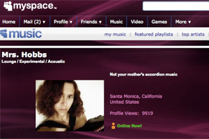 Of course, you're here on the Mrs. Hobbs website, but maybe you like Facebook, MySpace, YouTube, or want to join the fansite. You can also visit the sites for Ketchup Soup (the duo with Mrs. Hobbs and lovemando) and Mrs. Hoop (my hoop-dancing persona).